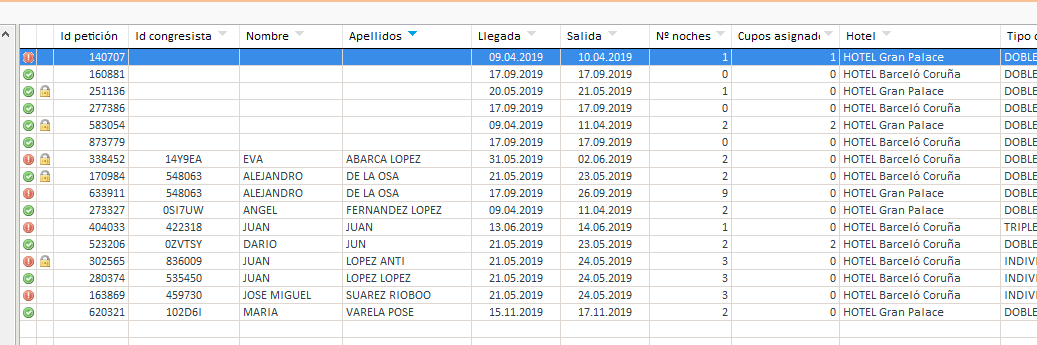Esta zona de la pantalla muestra todas las solicitudes de alojamiento del congreso.