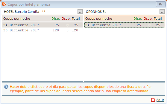 Simplemente seleccionar el hotel y la empresa, y hacer doble click con el ratón en el listado de fechas/cupos debajo del hotel en una fecha concreta. Se abrirá una pantalla que nos pedirá el número de cupos que quiero reservar para esa empresa, pulsamos "confirmar" y ya quedan asignados.
