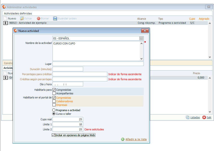El funcionamiento es similar que la pantalla de "tipos de inscripción". Al crear una nueva actividad podemos establecer a quien van dirigidas (congresistas, acompañantes, colaboradores) y los cupos que podemos habilitar para la página web.