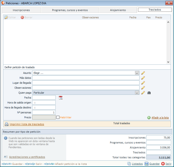 Editar: Pulsar sobre un traslado dos veces y se activa la opción de editar, para cambiar la petición.