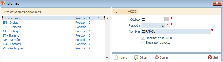 Código: Código abreviado del idioma. (lo dá el propio sistema en el desplegable).